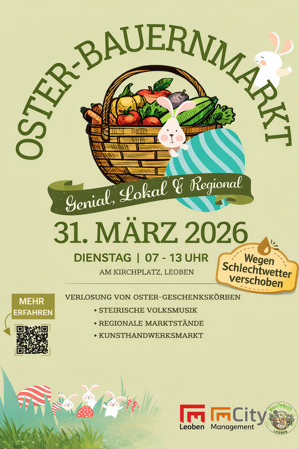 Aufgrund der aktuellen Sturmwarnung und der prognostizierten Schlechtwetterlage wird der ursprünglich geplante Osterbauernmarkt am 27. März am Kirchplatz in Leoben verschoben. Gemeinsam mit den teilnehmenden Bäuerinnen und Bauern sowie den Kunsthandwerker:innen wurde entschieden, die Veranstaltung auf Dienstag, den 31. März 2026, zu verlegen. Auch das musikalische Rahmenprogramm sorgt wieder für eine stimmungsvolle Atmosphäre und lädt zum Verweilen ein.